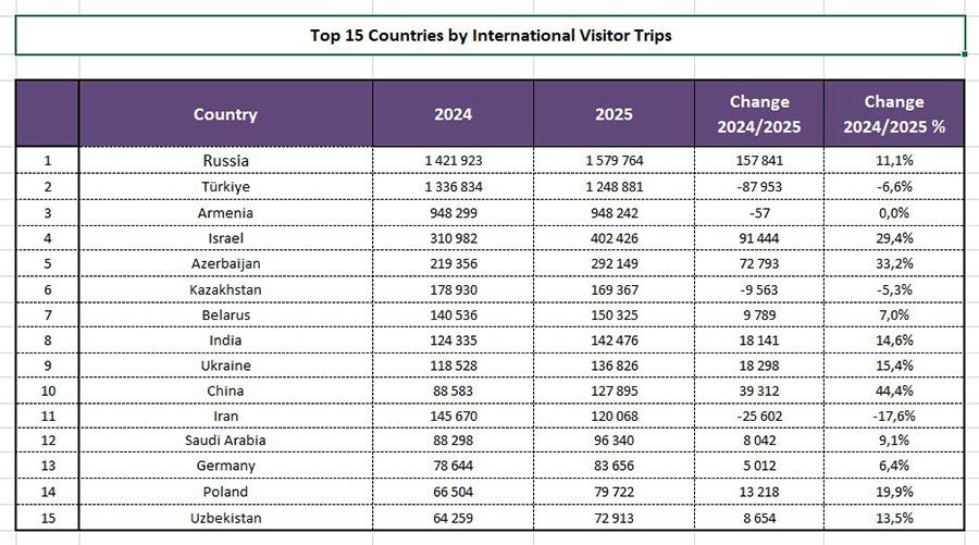 Больше всего визитов в Грузию традиционно совершили россияне — свыше 1,5 млн, что на 11,1% больше по сравнению с 2024-м. Одним из ключевых рынков остаётся Турция — более 1,2 млн (-6,6%). Третье место по числу поездок заняла Армения — 948 242, без резких колебаний.