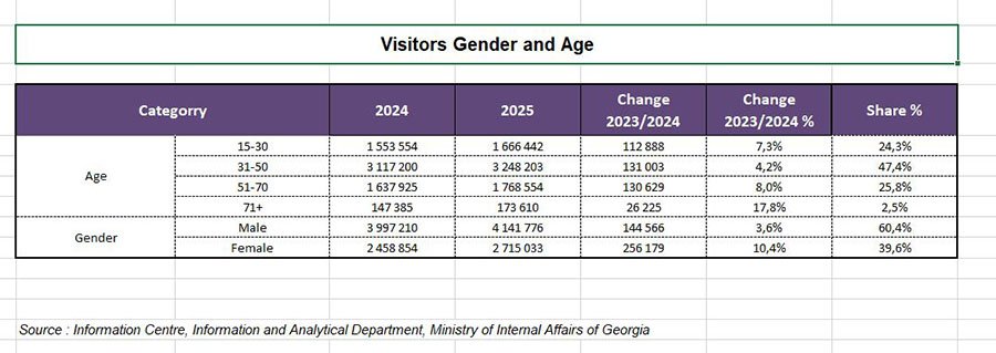 Число посетителей в возрасте от 51 до 70 лет выросло до 1,7 млн (+8,0%), доля составила 25,8%. Заметный вклад обеспечили и туристы в возрасте от 15 до 30 лет — 1,6 млн поездок (+7,3%). Наиболее высокие темпы роста зафиксированы среди посетителей старше 71 года. Хотя их доля остаётся минимальной — 2,5%, число визитов увеличилось на 17,8%, до 173 610.