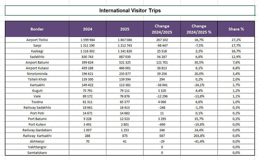 Наиболее значительные показатели по-прежнему у аэропорта Тбилиси — около 1,8 млн визитов, на 16,7% больше по сравнению с 2024-м. Доля столичного терминала составила 27,2%. Сарпи, традиционно один из самых загруженных сухопутных переходов, в 2025 году показал снижение на 7,5% — до 1,2 млн. КПП сохранил высокую долю в общей структуре въезда, однако его динамика контрастирует с ростом авиационных направлений. Казбеги завершил период с умеренным увеличением на 2,3%, до 1,14 млн. Садахло продемонстрировал более уверенную динамику: количество визитов выросло на 6,8%, до 887 030.
