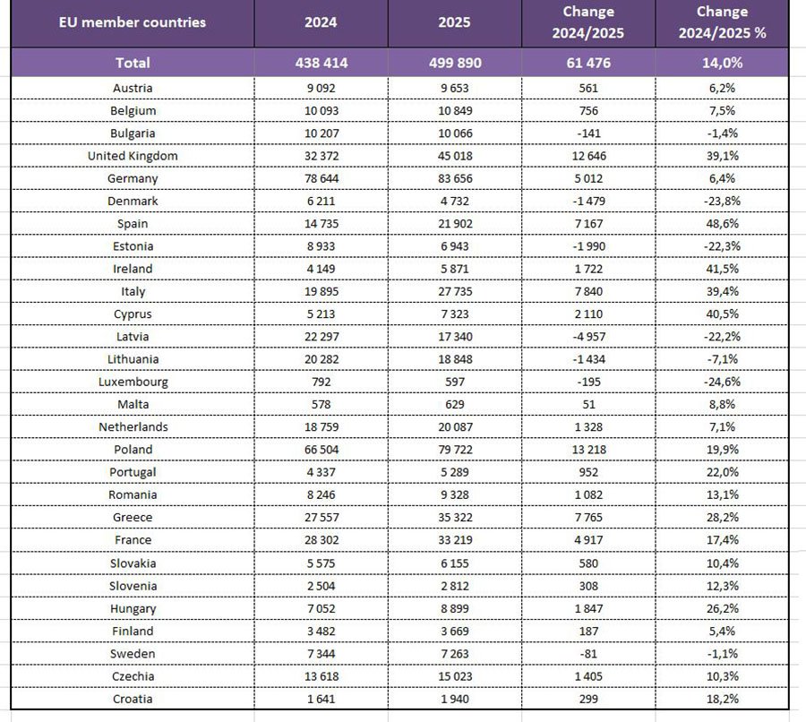 Лидировала Германия — 83 656 визитов (+6,4%), на втором месте Польша — 79 722 (+19,9%). Показатели Великобритании, замыкающей тройку, выросли на 39,1%, до 45 018. Из Греции зафиксировано 35 322 поездки (+28,2%), из Франции — 33 219 (+17,4%). Самый заметный рост отмечен по Испании — на 48,6%, до 27 984. Также выделяются Ирландия (+41,5%, 14 642), Кипр (+40,5%, 12 356) и Италия (+39,4%, 27 146).