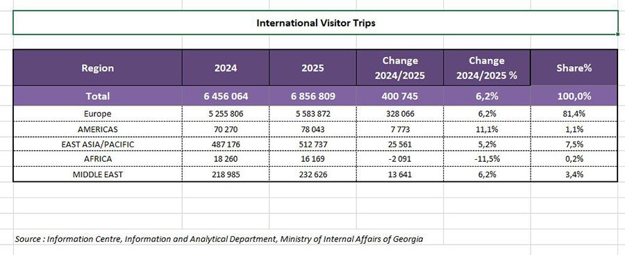 В 2025 году число международных поездок в Грузию достигло 6,86 млн — на 6,2% больше по сравнению с 2024-м, или на 400,7 тыс. Лидировали европейские страны — более 5,58 млн, доля превысила 81% от общего объёма.