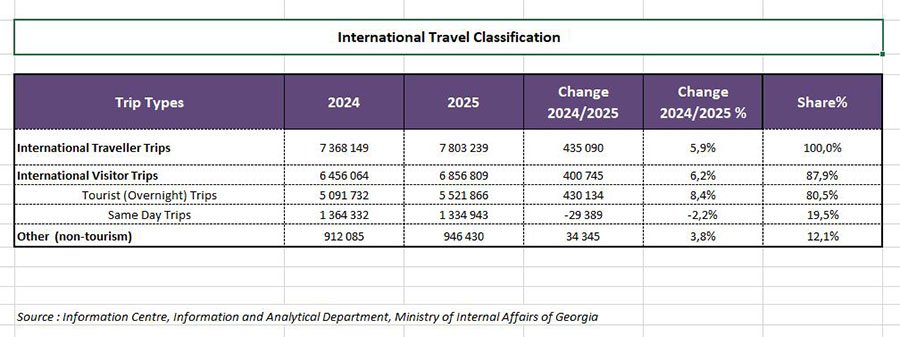 В Грузии вновь зафиксированы рекорды по визитам путешественников, сообщает Национальная администрация туризма. Общий показатель в 2025 году увеличился на 5,9% относительно 2024-го, превысив 7,8 млн. Число туристических поездок выросло на 8,4% — до 5,5 млн. Расширяется география рынков, а сезонность становится менее выраженной.