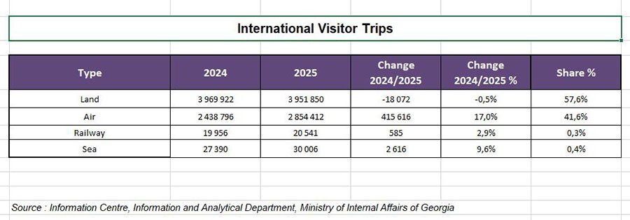 Структура въездных поездок в Грузию заметно сместилась в сторону авиаперелётов. Число прибытий воздушным транспортом выросло до 2,85 млн, что на 17% больше по сравнению с 2024-м. Доля авиасообщения достигла 41,6%. Наземные маршруты, несмотря на сохранение лидерства по объёму, показали небольшое снижение. Через сухопутные границы в страну приехали 3,95 млн человек, что на 0,5% меньше показателя 2024 года. Их доля составила 57,6%.