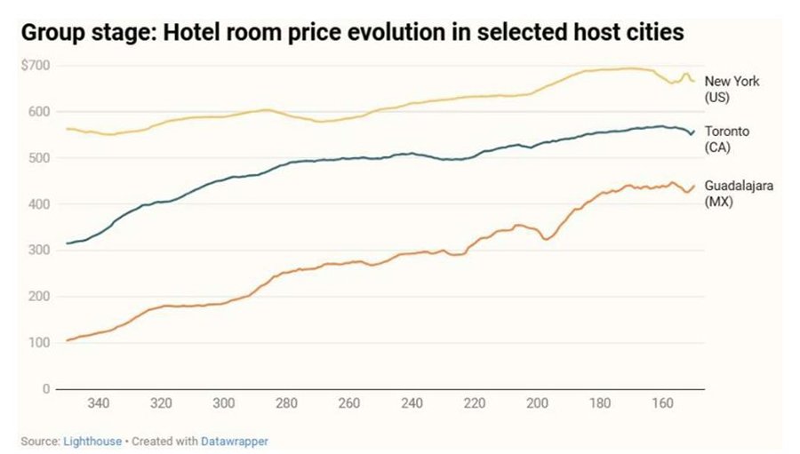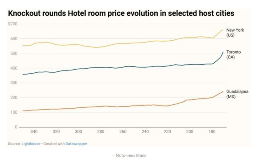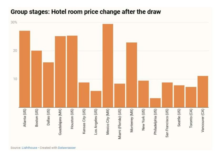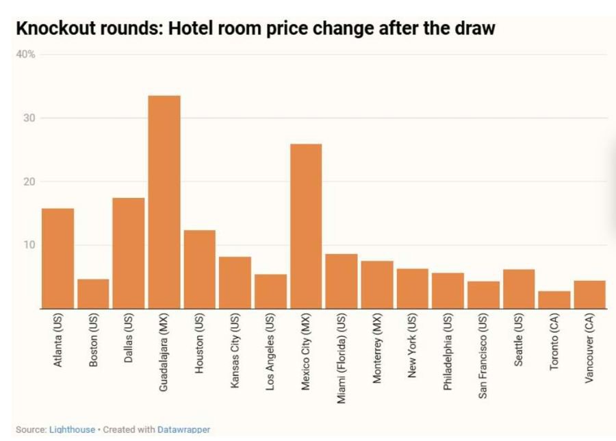Максимальные изменения после жеребьёвки зафиксированы в Гвадалахаре, Мехико и Далласе. В то же время Торонто, Сан-Франциско и Ванкувер почти не изменились, что указывает на эффект заранее заложенной высокой базы. Средний прирост по плей-офф составил около 10,5%. Самыми дорогими направлениями остаются Ванкувер, Нью-Йорк и Бостон — как до, так и после публикации сетки турнира.