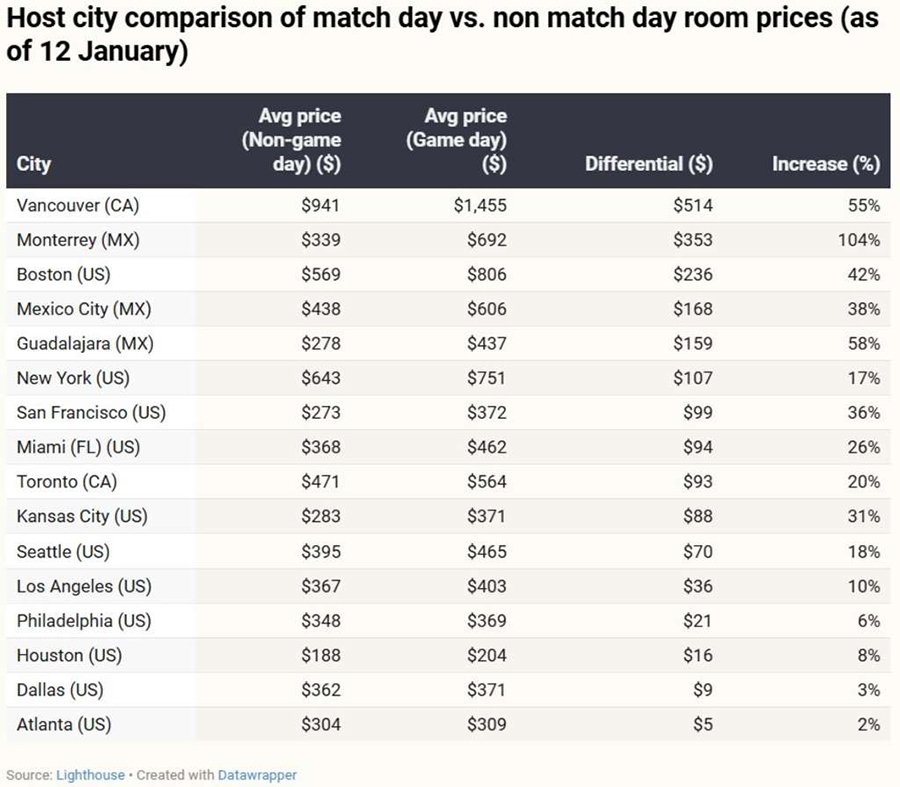 Разрыв между рынками остаётся крайне высоким. Ванкувер стал самым дорогим городом группового этапа со средней ставкой около $1 230 за ночь, тогда как Хьюстон остаётся самым доступным направлением — примерно $225. Даже после общего повышения разница между крайними значениями превышает шесть раз.
