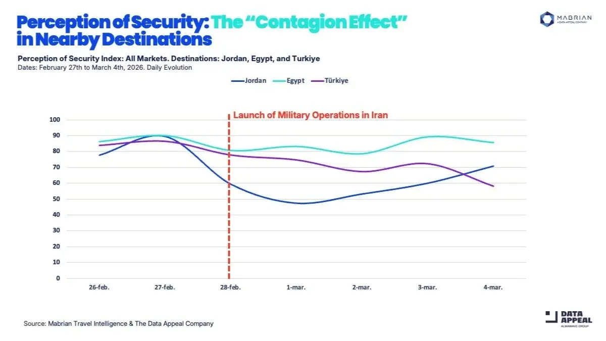 Эскалация конфликта на Ближнем Востоке уже начала менять глобальные туристические потоки. Новые данные аналитической компании Mabrian показывают резкое ухудшение восприятия безопасности в странах Персидского залива, что может привести к перераспределению международного туристического спроса в пользу Европы, Азии и других направлений.