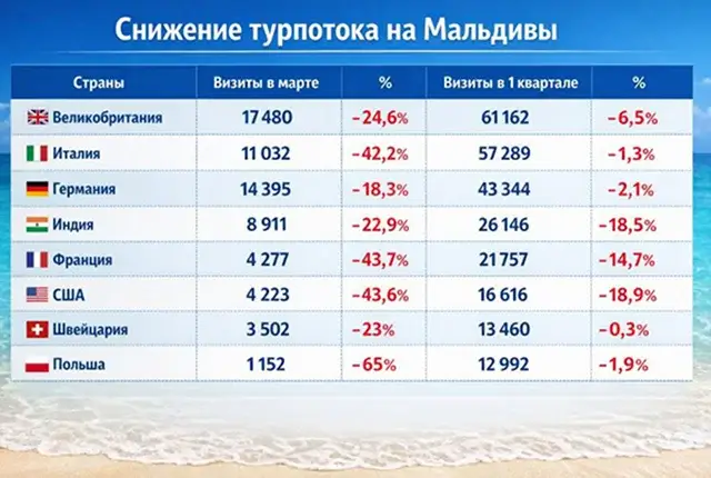 Кризис на Ближнем Востоке привел к отмене недорогих стыковочных рейсов через хабы Персидского залива и значительному сокращению международного турпотока на Мальдивы. В марте 2026 года количество прибывших иностранных туристов уменьшилось на 20,7% относительно такого же периода 2025-го — до 161 259 человек, сообщает АТОР. Снижение коснулось большинства западных рынков и Индии, в то время как российский и китайский потоки продолжают расти.