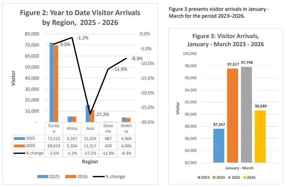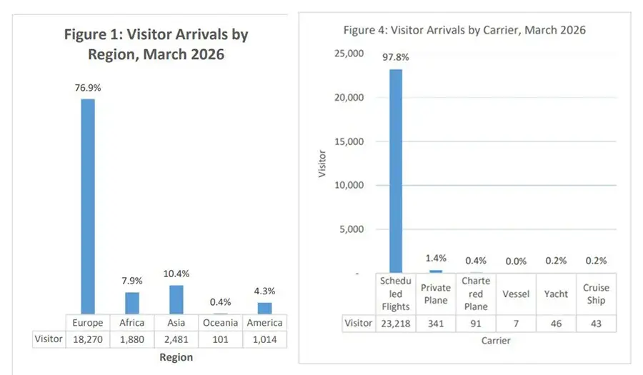 Европа сохранила доминирующее положение, обеспечив 76,9% всех прибытий в марте (18 270), но при этом отмечено сокращение на 3,5%. Доля Азии составила 10,4% (2 481), в динамике с начала года именно она показала наиболее резкое снижение — на 27,2%. На Африку пришлось 7,9% прибывающих на Сейшелы — 1 880 (–1,2%). Далее следуют Америка — 4,3% или 1 021 (–8,3%) и Океания — 0,4% (–11,9%).