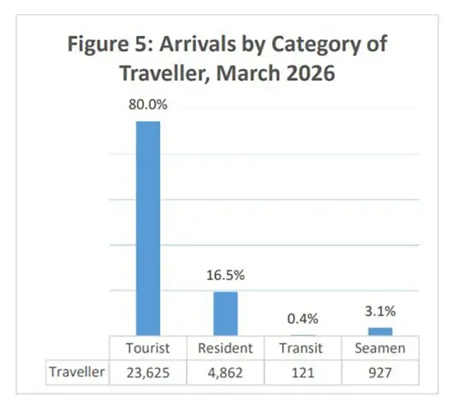 В структуре прибытий 80% составляли туристы (23 625), резиденты — 16,5%, моряки — 3,1%, транзитные пассажиры — менее 1%.