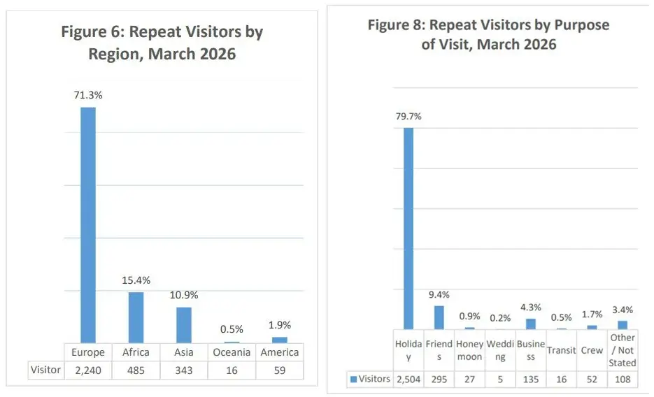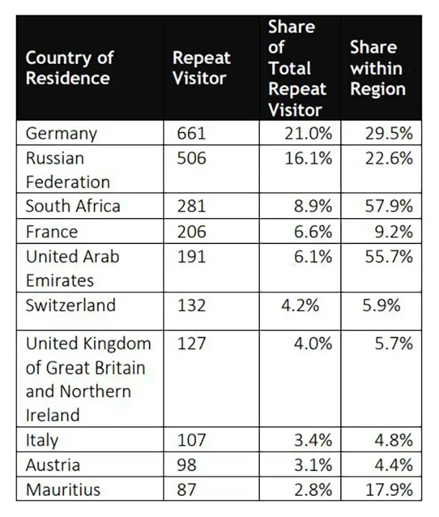 Доля повторных туристов составила 13,2% (3 143 человека). Основной поток таких гостей пришелся на Европу — 71,3%. Среди стран лидировали Германия (661) или 21% всех повторных визитов, Россия (506) и Южно-Африканская Республика (281).